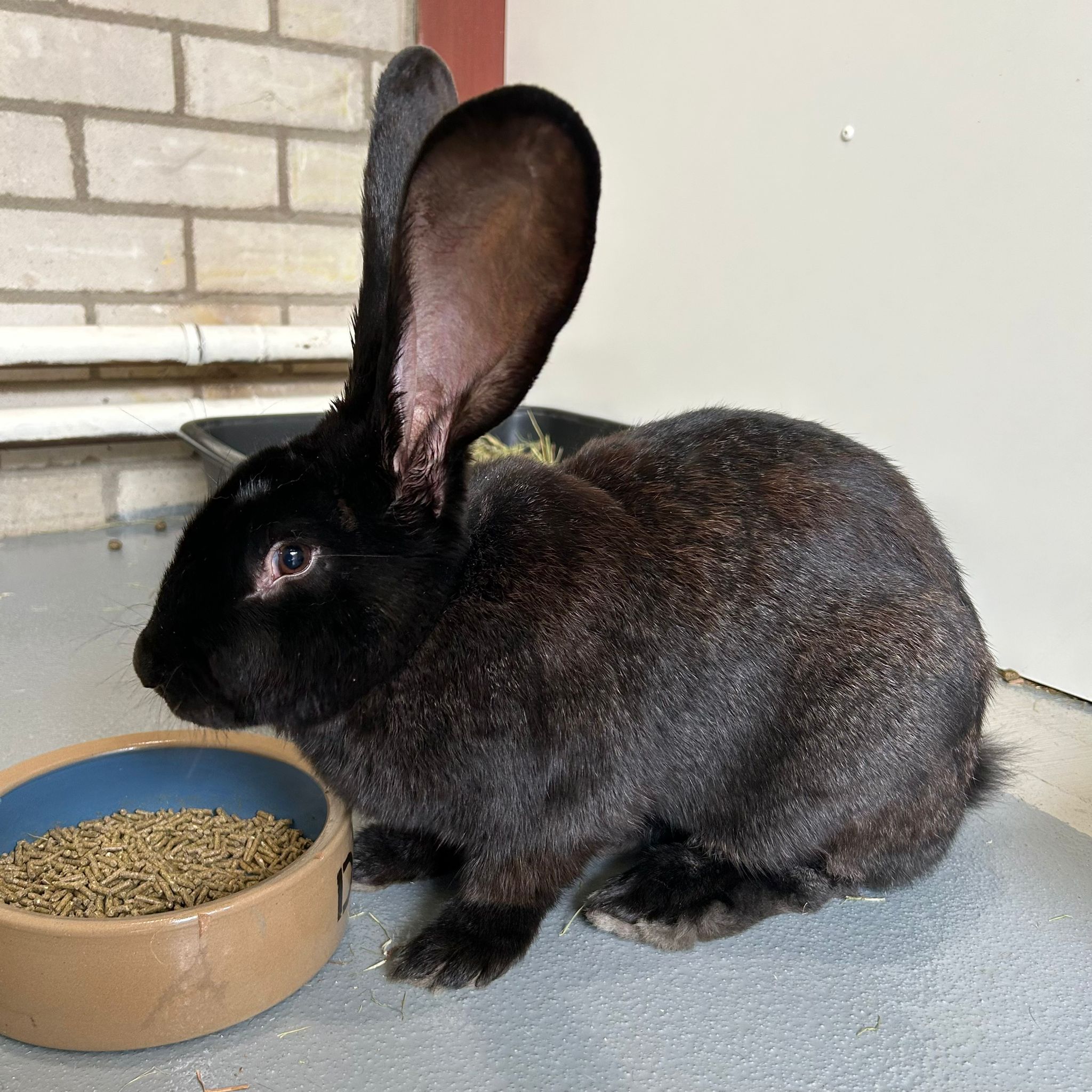 Minx is een prachtige Vlaamse reus met een rustig, zachtaardig karakter. Ze vindt het heerlijk om te ontspannen en beleeft de wereld op haar eigen tempo. Minx is een intelligente dame; ze laat duidelijk weten wanneer ze honger heeft en maakt daarvoor geluid met haar voerbak. Ze is door ons behandeld voor haar oren, waardoor ze het spannend vindt wanneer je haar bij haar daar aanraakt. Met tijd, geduld en vertrouwen, verwachten wij dat ze zich hierbij uiteindelijk op haar gemak gaat voelen. Aaien vindt ze verder helemaal prima, oppakken vindt ze minder prettig. We plaatsen Minx bij een gecastreerde rammelaar in een ruim binnenverblijf. Uiteindelijk zal ze graag naar buiten willen. Minx kan eventueel bij kinderen vanaf 6 jaar geplaatst worden.