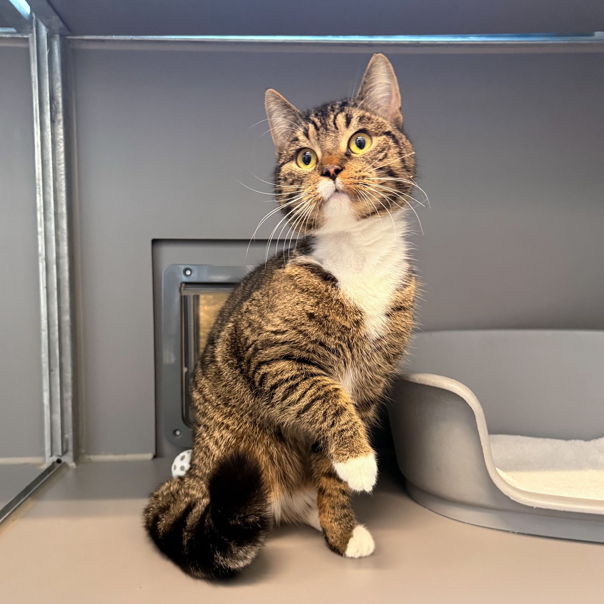 Muffin is een lieve, aanhankelijke jonge kater die gezelschap écht opzoekt. Met zijn stem laat hij duidelijk horen wanneer hij aandacht wil. hij geniet duidelijk van een knuffelsessie en vindt het geen enkel probleem om eventjes in je armen te liggen. Naar verwachting zal Muffin zich snel thuis voelen in zijn nieuwe omgeving, al zal hij hele dagen alleen thuis niet prettig vinden. Muffin is een echte levensgenieter wanneer het om eten gaat, maar is gelukkig niet geobsedeerd. We zoeken voor Muffin een gezellig huishouden waar veel aandacht voor hem is en geen andere katten aanwezig zijn. Hij kan prima bij kinderen vanaf 6 jaar geplaatst worden. Na een wenperiode zal Muffin naar buiten willen om de rustige/groene omgeving te ontdekken.